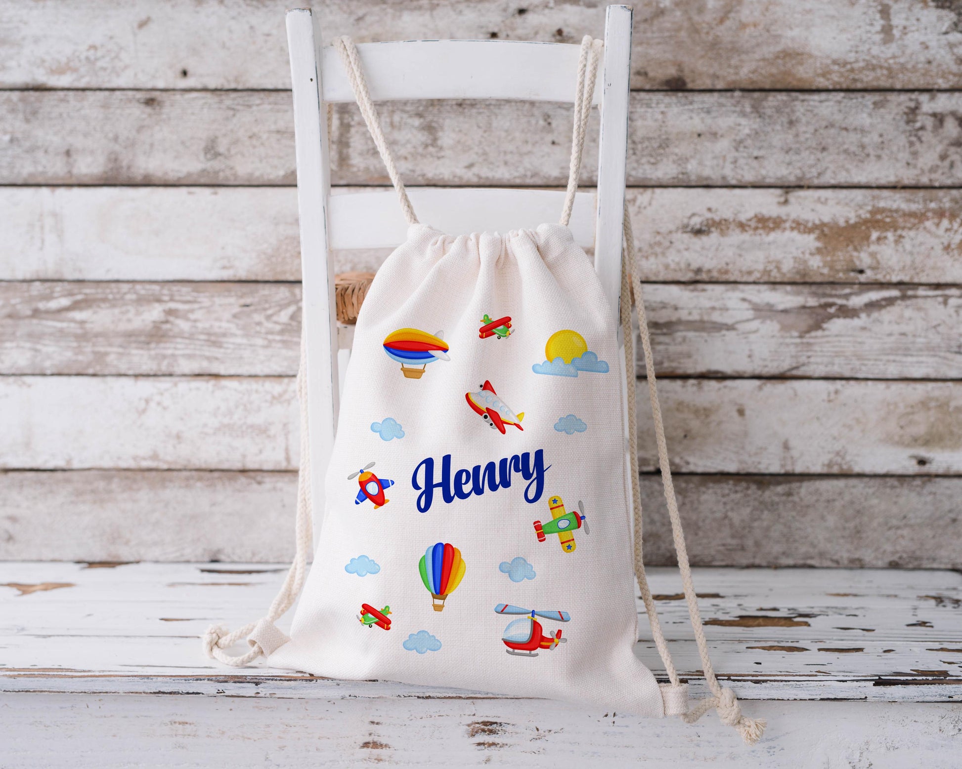 Personalised Drawstring Bag with cute transport design and the child's name. Ideal for school, swimming, gym, PE, nursery or pre-school. Enter the name you'd like on the bag in the personalisation box.